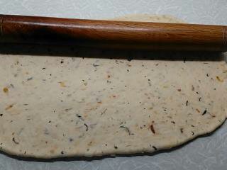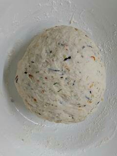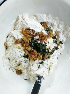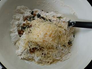 Воду с дрожжами добавляем в мучную смесь, туда же вливаем оставшуюся воду, кладем поджаренный лук вместе с маслом, 50 г натертого сыра, зелень и все перемешиваем.