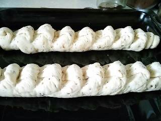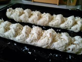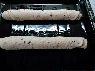 Получившиеся два рулета выкладываем на противень, смазанный растительным или сливочным маслом. Накрываем чистым кухонным полотенцем. Оставляем подходить на полчаса.