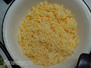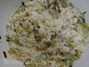В массу вмешиваем оставшуюся часть кабачков, тертый сыр, соль и перец. Немного сыра оставляем для присыпки формы и запеканки.