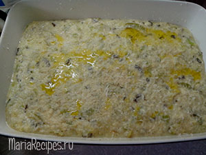 В форму (можно взять разъемную, у меня керамическая прямоугольная), смазанную 1 ст. л. сливочного масла, насыпаем немного тертого сыра, выливаем на него кабачковую массу, присыпаем ее остатками тертого сыра и сбрызгиваем оливковым маслом.