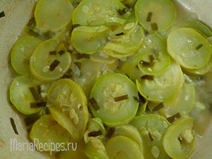 Закладываем в сковородку кабачки, наливаем 200 г воды, закрываем крышкой и оставляем кабачки тушиться на слабом огне около 20 минут.