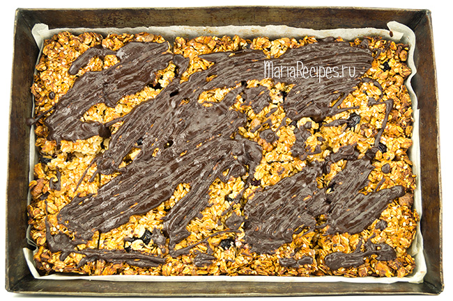 Я готовила эти батончики лично для себя, не думала, что еще кому-то они придутся по вкусу, но гранола понравилась даже детям! Тут не обошлось без хитрости: я сдобрила массу шоколадной глазурью.
