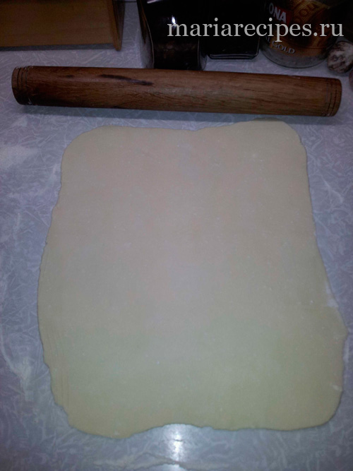 Достаем по одному наши колобки теста из холодильника, раскатываем в овал или прямоугольник — у кого что получится. Толщина теста — 3-4 мм.