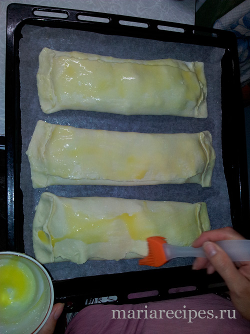 Сначала загибаем короткие края на яблоки (чтобы с краю не вытекал сок), а затем защипываем длинные стороны по типу вареника ))) Смазываем яйцом.