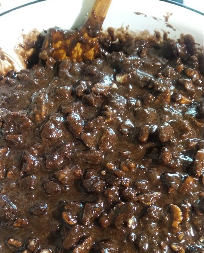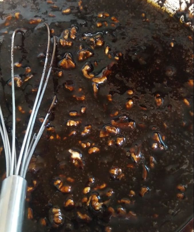 В кипящую смесь всыпаем орехи и даём ей покипеть вместе с ними ещё с минуту. Чуть проваренные орехи будут вкуснее.