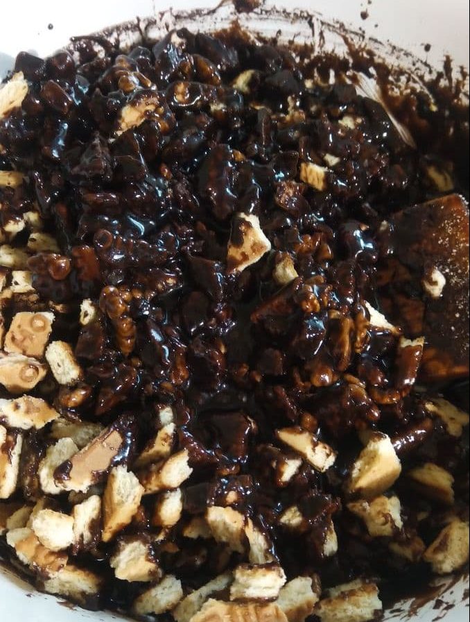 Затем добавляем оставшееся печенье и опять все перемешиваем.