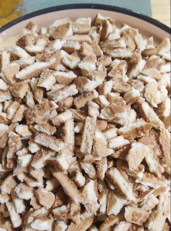 Печенье крошим на кусочки размером примерно 1 х 2 см, такие будут красивее смотреться на срезе.