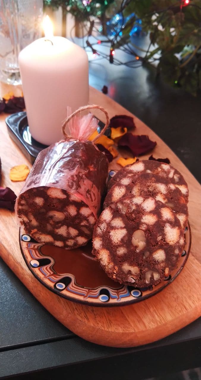 Сейчас я шоколадной массой наполняю специальную упаковку, предназначенную для приготовления мясных колбас. Раньше, когда такое чудо достать было невозможно, мама умудрялась формовать колбасу с помощью пергаментной бумаги и скотча. Думаю, фольга, сложенная в несколько слоев, тоже вполне подойдет для «упаковки» этой кондитерской колбасы.