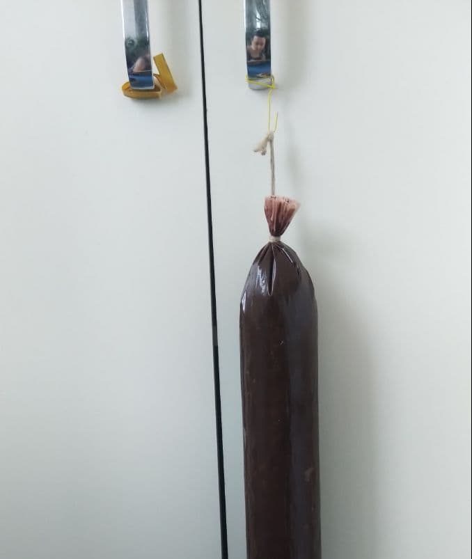 На одном из концов делаем из шпагата петлю, чтобы подвесить колбасу. Она должна отвисеться и уплотниться под собственной тяжестью.