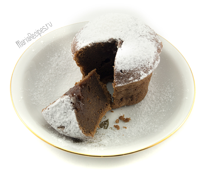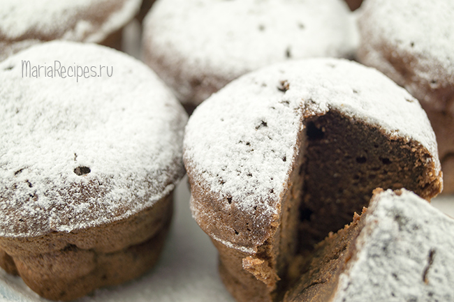 Кстати, признаюсь, что у меня никак рука не поднимается вынуть кексики из духовки ну прямо вот ровно через 7 минут. Я дожидаюсь, пока у них поднимутся шапочки, а это минут 10-12. В итоге в самом верху фондана остается немного жидкого теста, а остальное — мегашоколадное и влажное, но по консистенции приближенное к привычным кексам.