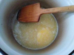 Готовим водяную баню. Для этого в кастрюлю большего диаметра наливаем воду, даем ей закипеть и ставим в нее кастрюльку поменьше. Кладем в маленькую кастрюльку сливочное масло и засыпаем сахар. Растапливаем смесь, помешивая, до однородности.