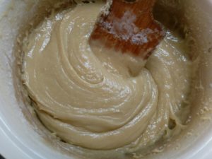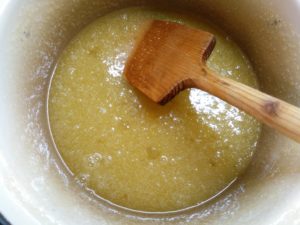 Ставим смесь на малюсенький огонь и постоянно ее помешиваем. Масса должна постепенно побелеть, загустеть и чуть вспениться. По времени это займет минуты две-три.