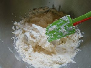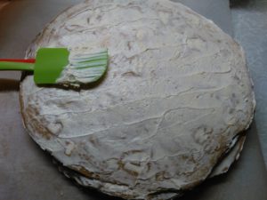 После взбивания крем в холодильник не ставим, а сразу начинаем промазывать коржи, из расчета примерно по 2 столовые ложки на каждый.